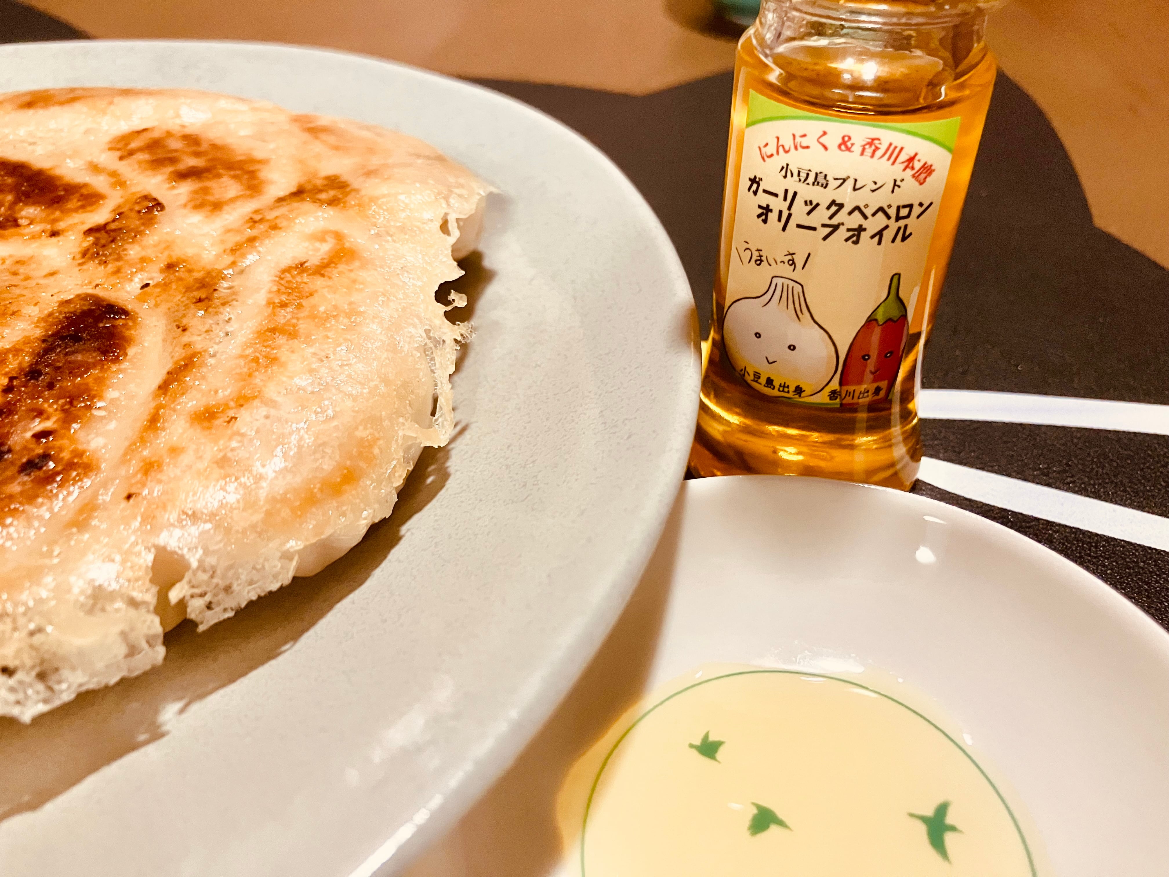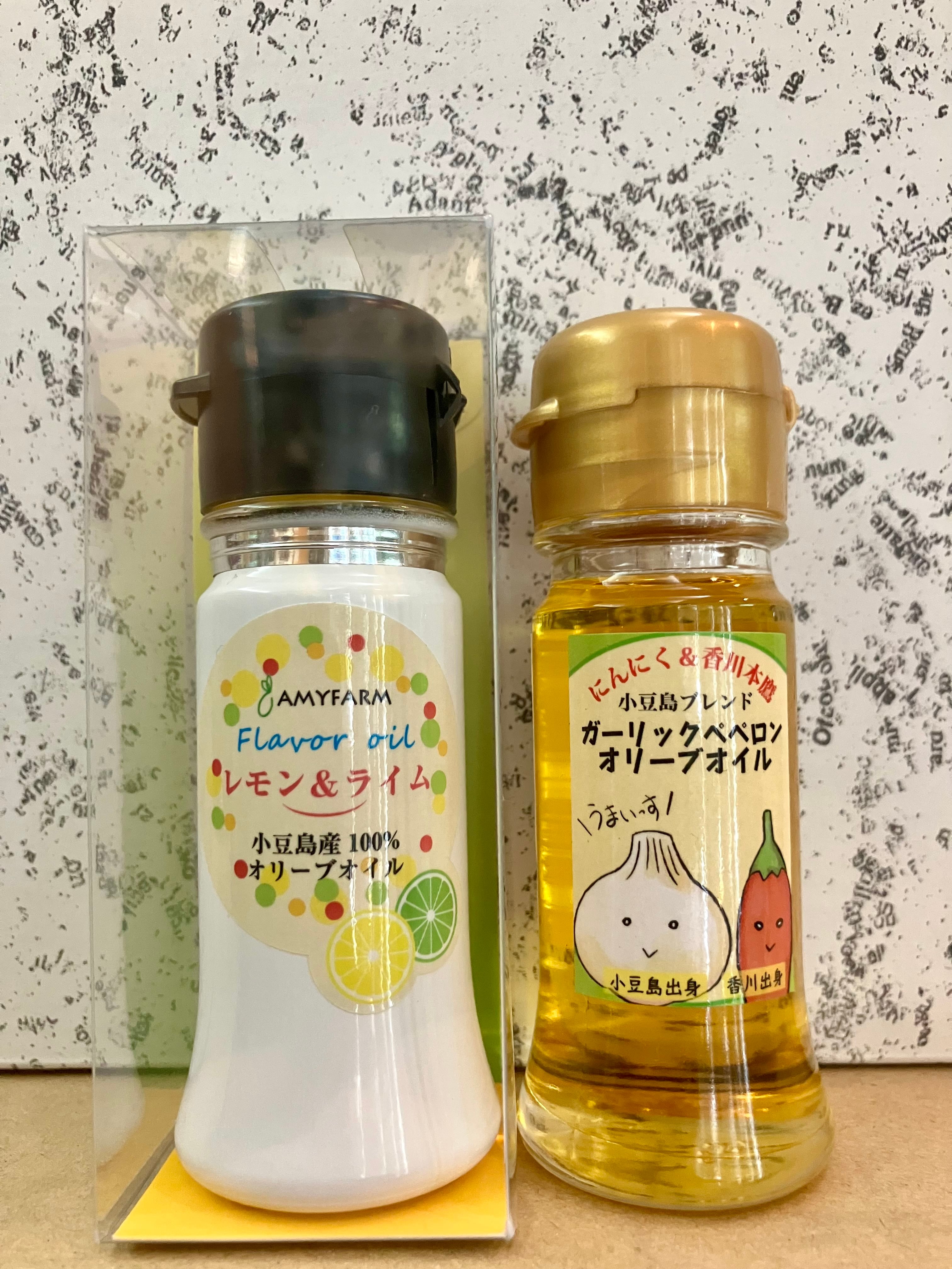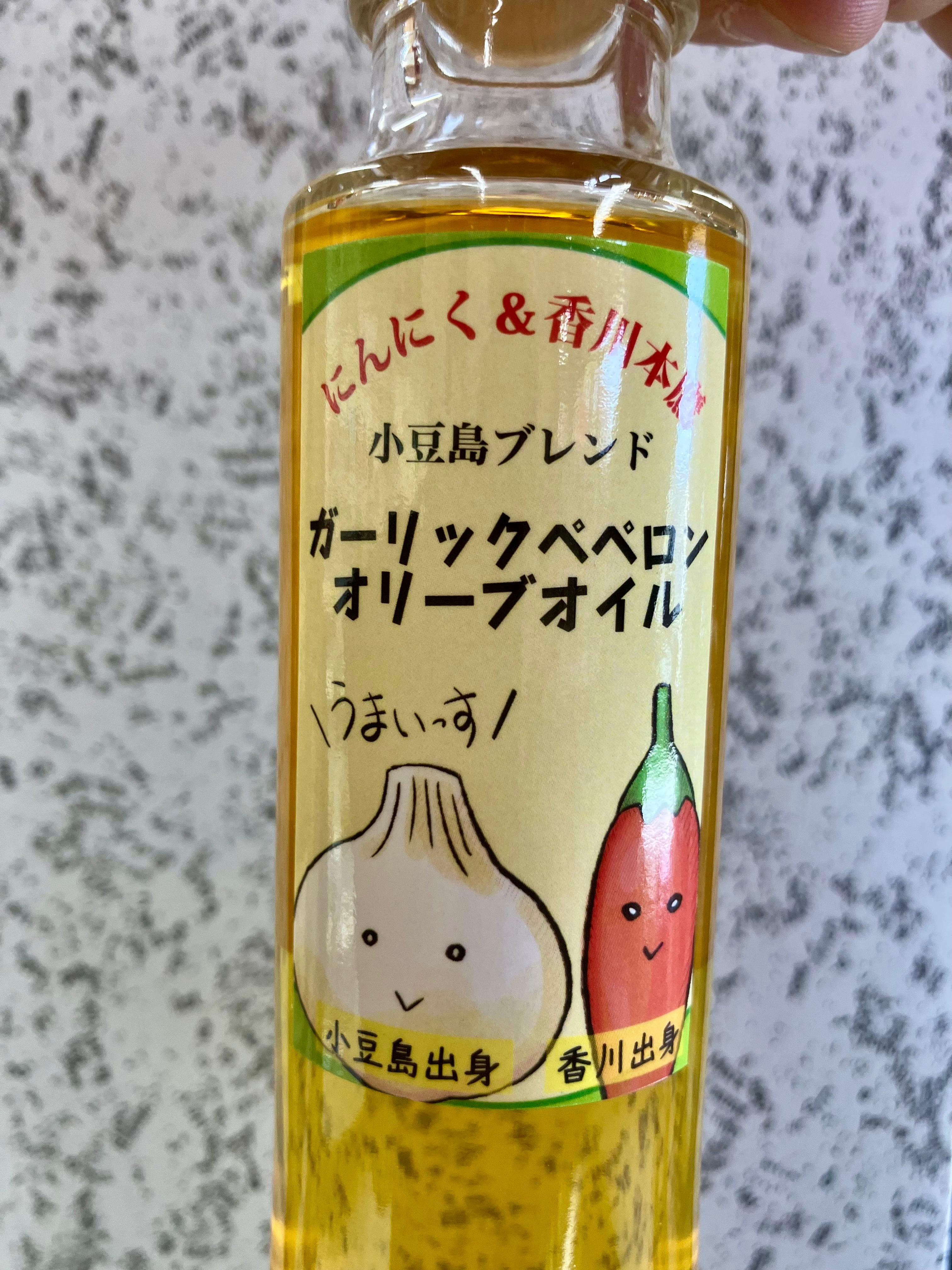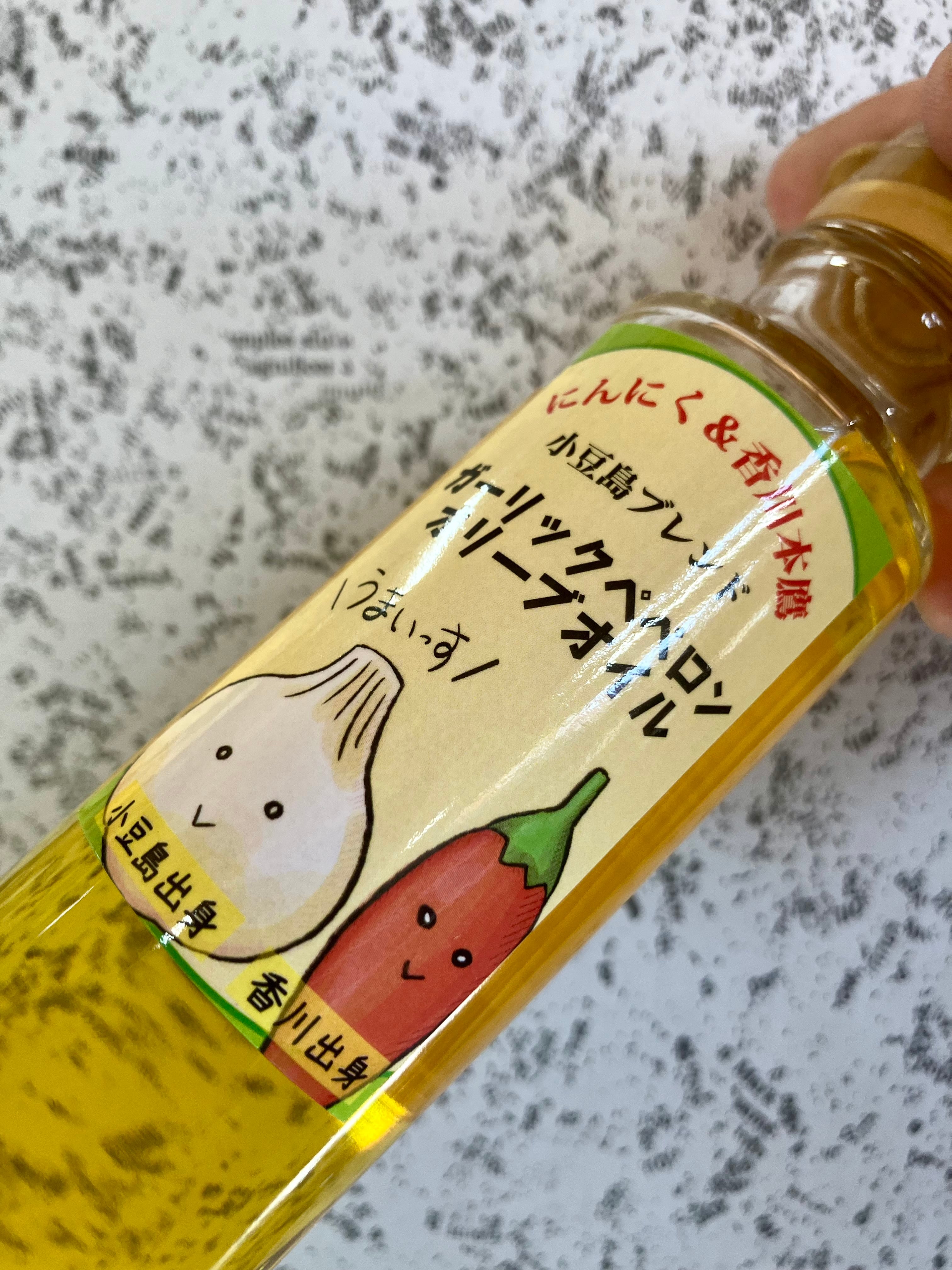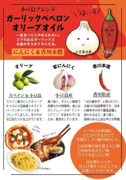 小豆島産オリーブオイルとスペイン産オリーブオイルをブレンドしたものに、小豆島産「紫にんにく」、香川県産「※香川本鷹」をプラスしたペペロンチーノ風なフレーバーオイル!
