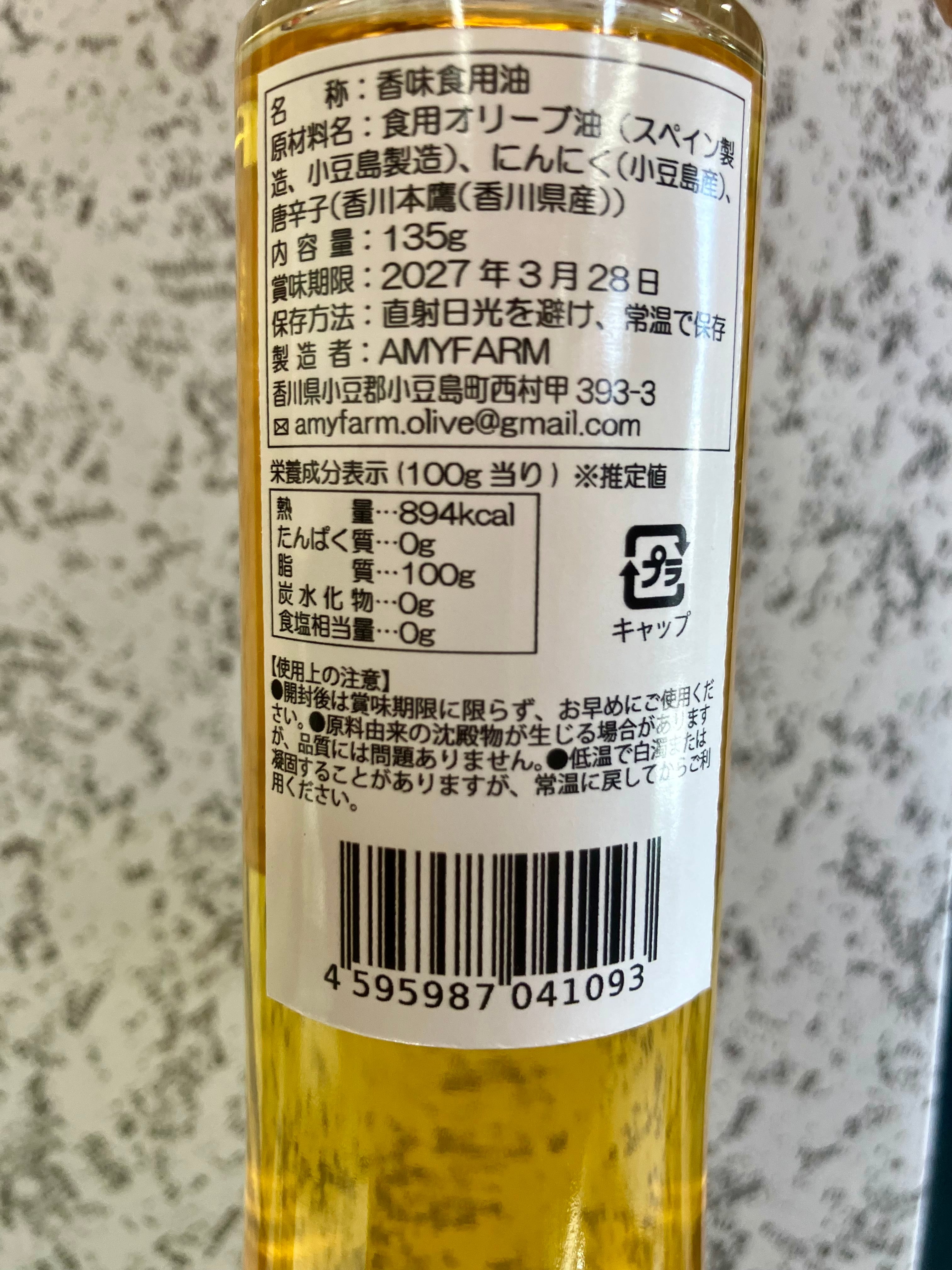 原材料名・・食用オリーブ油(スペイン製造、小豆島製造)、にんにく(小豆島産)、唐辛子(香川県産)