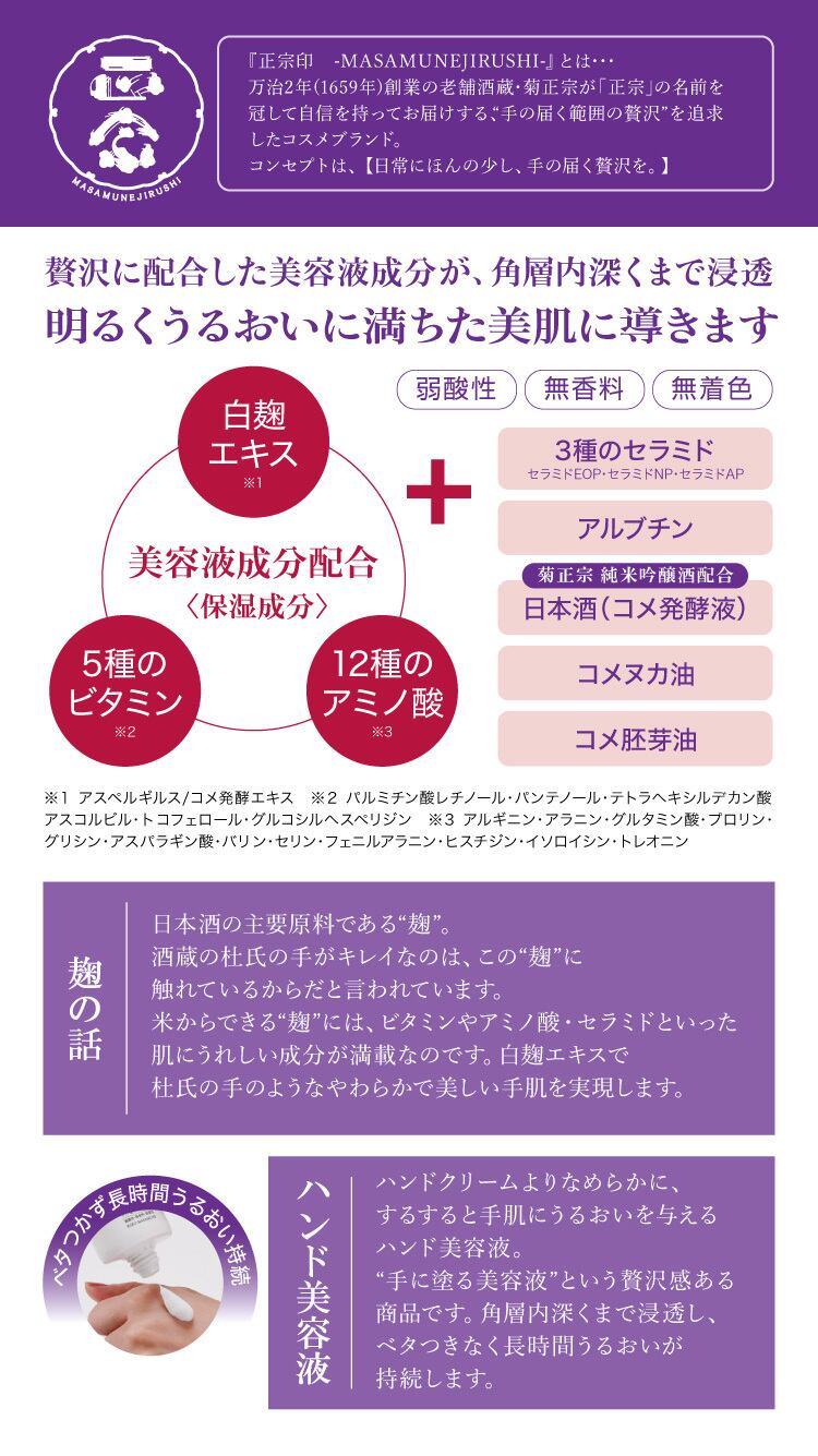 日本酒の主要原料である“麹”。酒蔵の杜氏の手がキレイなのは、この“麹”に触れているからだといわれています。米からできる“麹”には、ビタミンやアミノ酸・セラミドといった肌にうれしい成分が満載なのです。白麹エキスで杜氏の手のようなやわらかで美しい手肌を実現します。