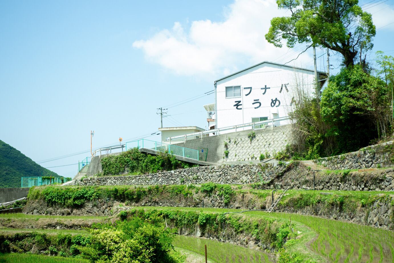 【船波製麺所】さんは、名水百選にも選ばれている、湯船の湧水が流れる、小豆島有数の景観スポットの一つ、棚田「千枚田」を見渡せる中山地区に位置する製麺所。