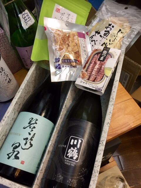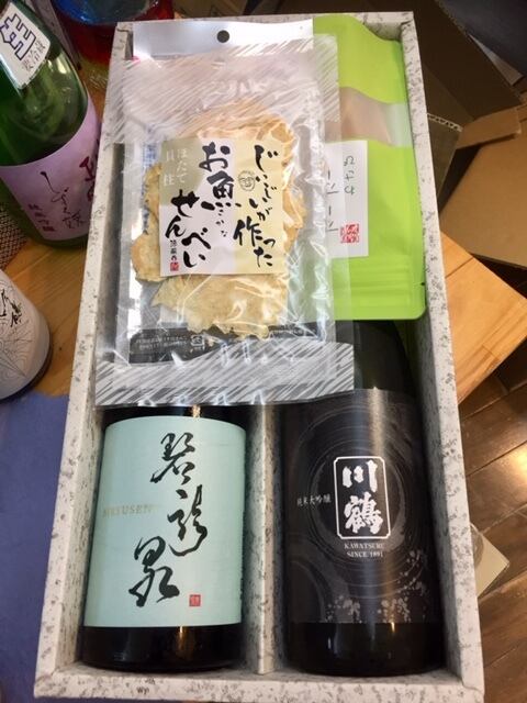 当店でもよく売れている蔵の日本酒におつまみを入れたギフトセットです。