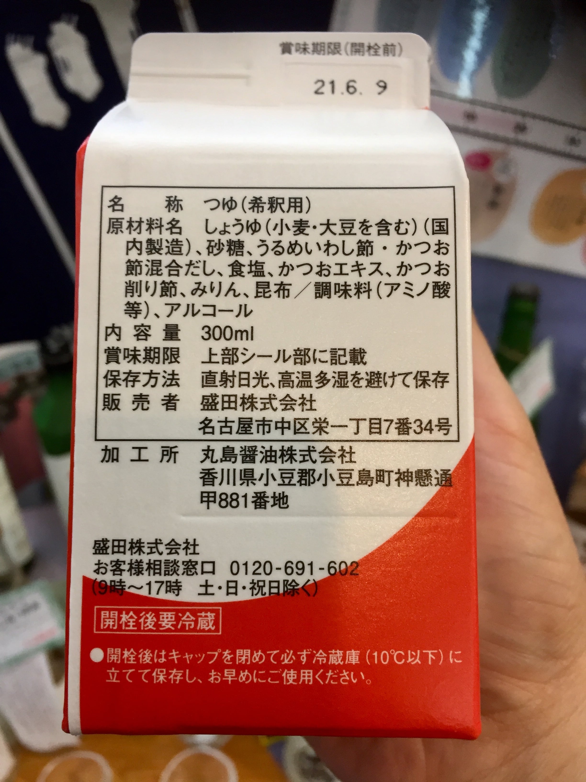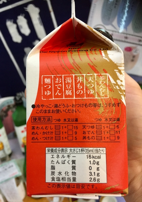 原材料名:しょうゆ(本醸造)、砂糖、うるめいわしぶし・かつおぶし混合だし、食塩、かつおエキス、かつお削りぶし、みりん、こんぶ、調味料(アミノ酸等)、アルコール、(原材料の一部に大豆、小麦を含む)