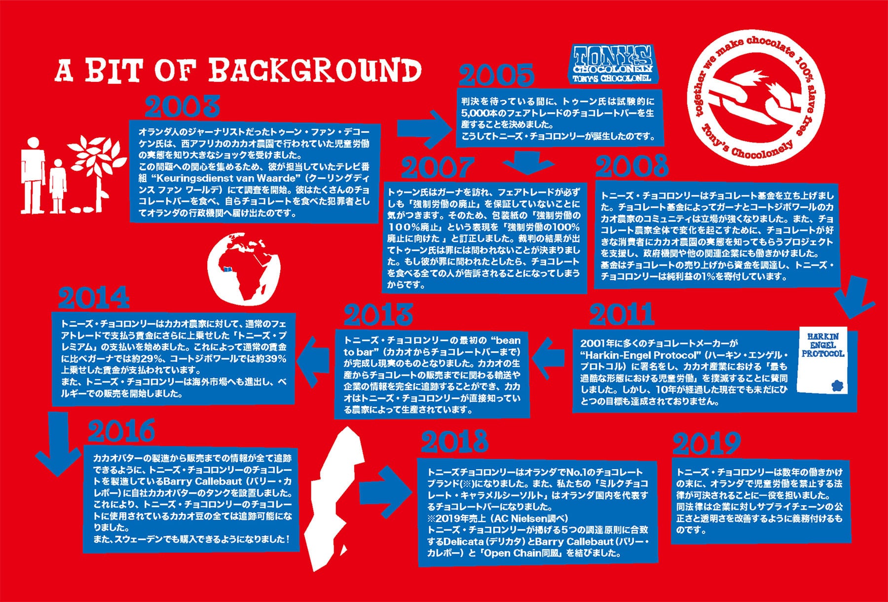 世界中の人々が奴隷制に関わらないチョコレートを選び、トニーズの理念を共有する事により、100%奴隷の存在しないチョコレートが早く世界のカカオ業界の標準となる事を目的に事業を行っています。